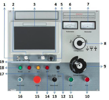 9 Voltage control knob: When this knob is in the zero position, the zero position light is on and the high voltage can be started. The voltage can be increased only after the high voltage is started.